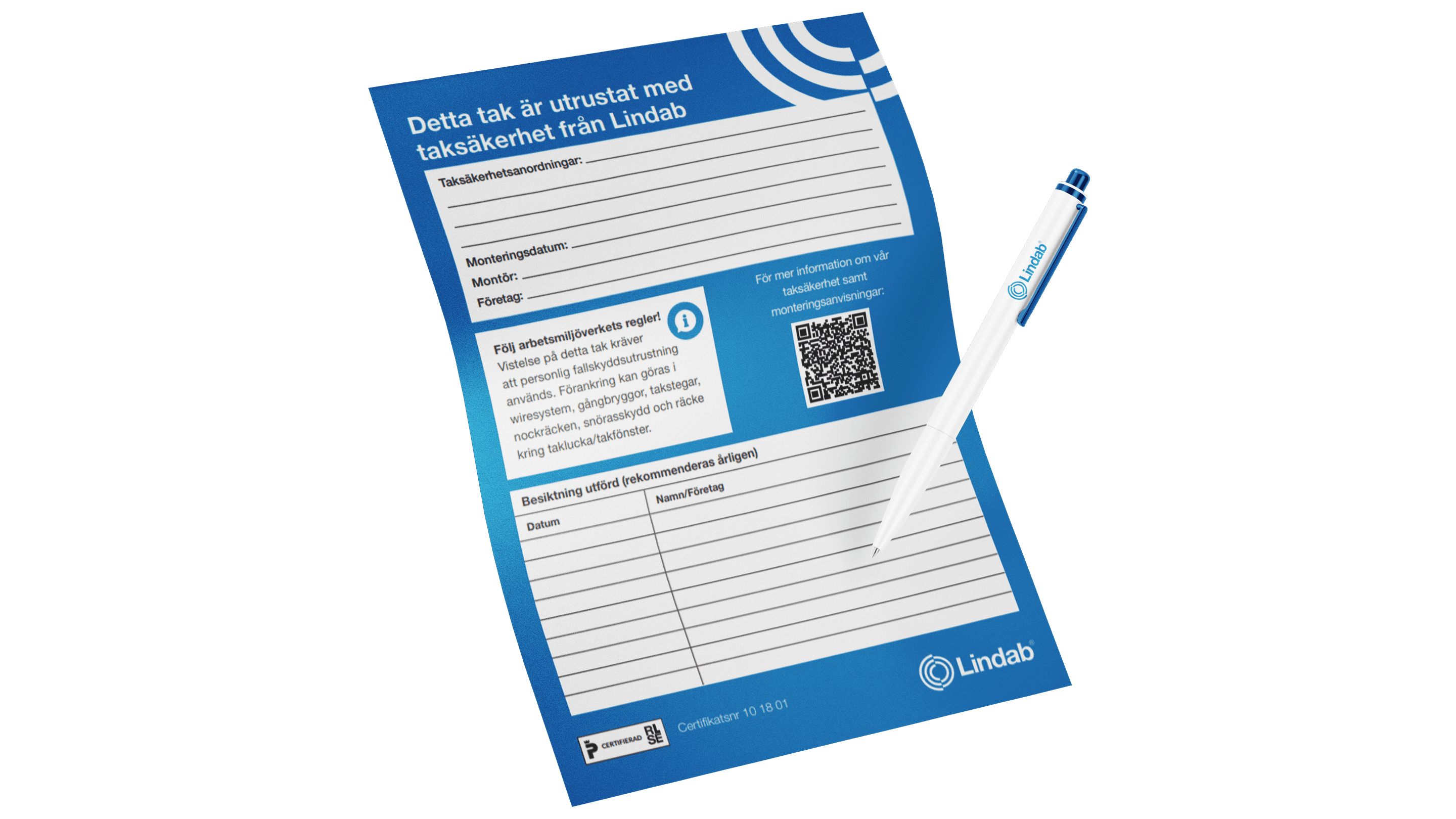 Om du har installerat Lindabs taksäkerhet finns det krav på att ha en informationsskylt där man kan få mer info om taksäkerhetsprodukterna, vilket datum det är monterat och vilket datum det är besiktigat. Finns som beställningsvara hos oss i samband med din order av taksäkerhet. Tillverkad i plast och placeras där man stiger upp till taket.