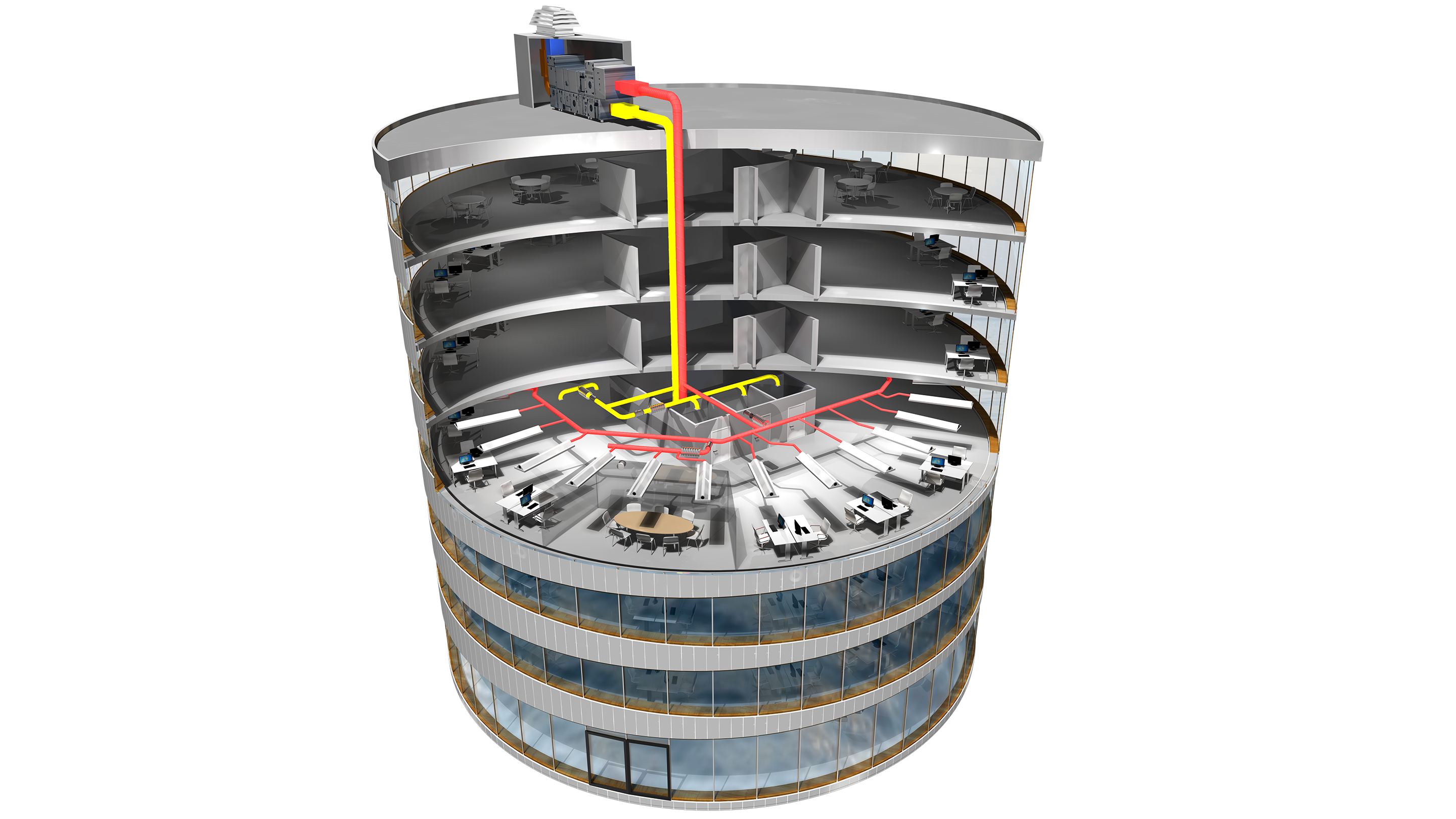 Solus-lösningen skapar ett behagligt inneklimat med en jämn temperatur i hela kontorsbyggnaden och alla dess rum. Det innebär också att man bara behöver förse byggnaden med den energi som motsvarar skillnaden mellan kylbehovet och värmebehovet, vilket sänker den totala energiförbrukningen för uppvärmning med ca 10-15 %