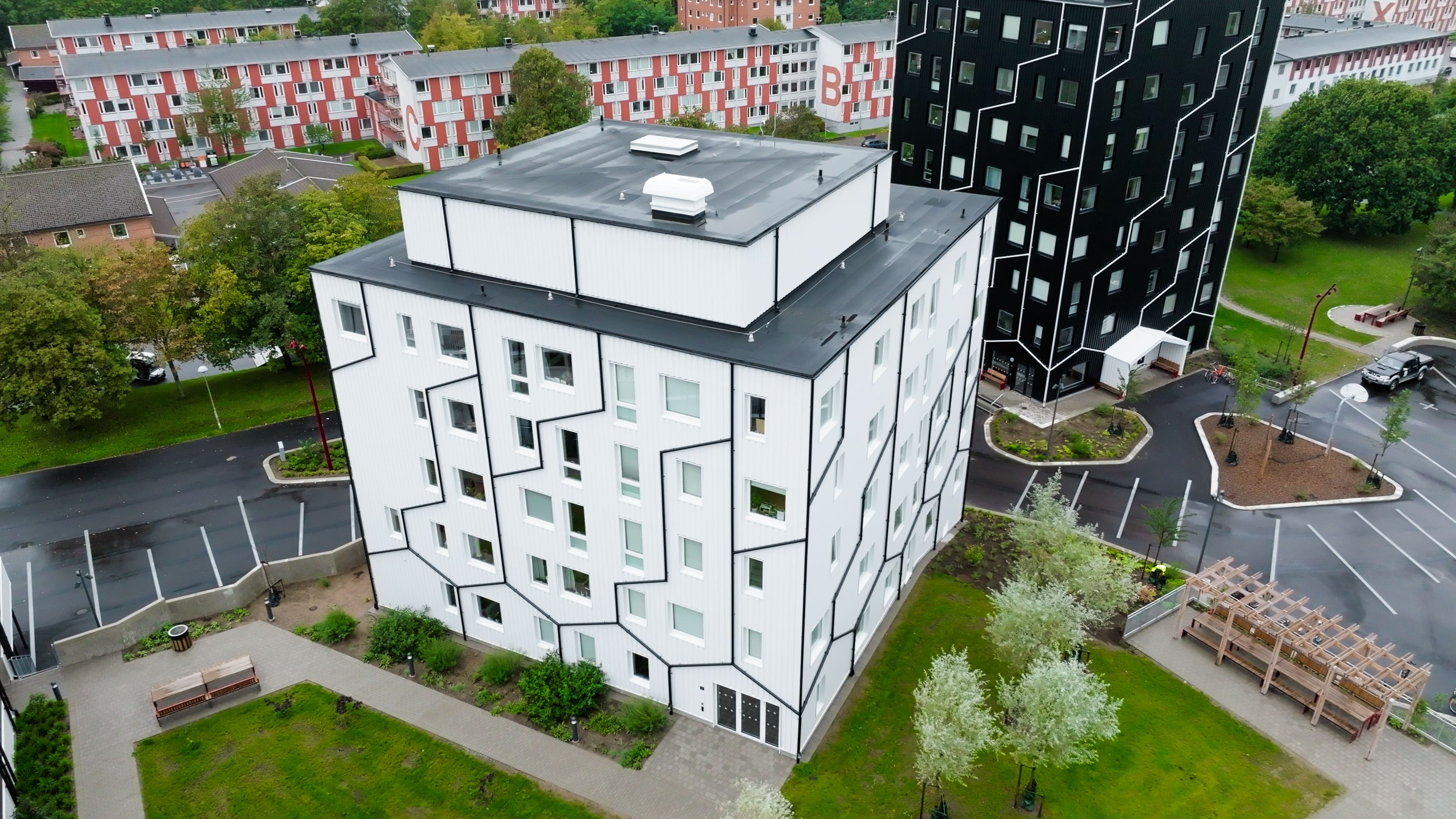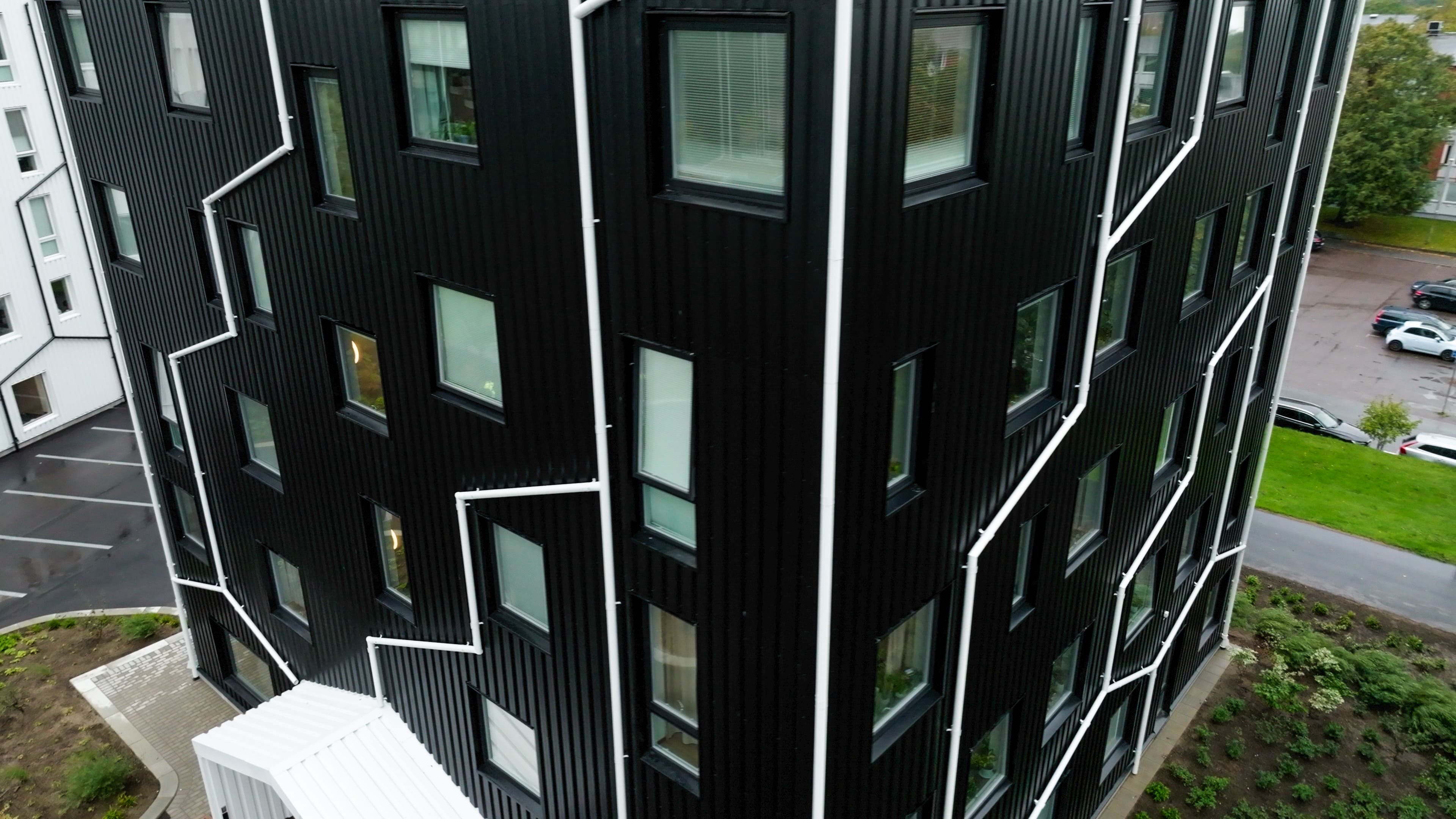 Färgvalet av svart och antikvit ger byggnaderna en distinkt och kraftfull look, samtidigt som det ger en hyllning till punkens råhet och ungdomlighet. Denna kreativa användning av takavvattningssystemet har inte bara förbättrat byggnadernas estetiska värde, utan också bidragit till en mer hållbar och kostnadseffektiv lösning.