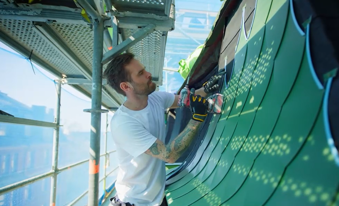 "När jag var på Lindabs fabriksvisning i Förslöv fastnade jag för maskinen som skär ut unika mönster. Och när detta projekt dök upp hade jag den utskärningstekniken i åtanke. Genom ett jättesmidigt samarbete med Lindab kunde vi tillsammans ta fram utformningen av löven. Att få de utskurna har varit första nyckeln till att göra detta unika projekt möjligt", säger Andreas Holmberg.