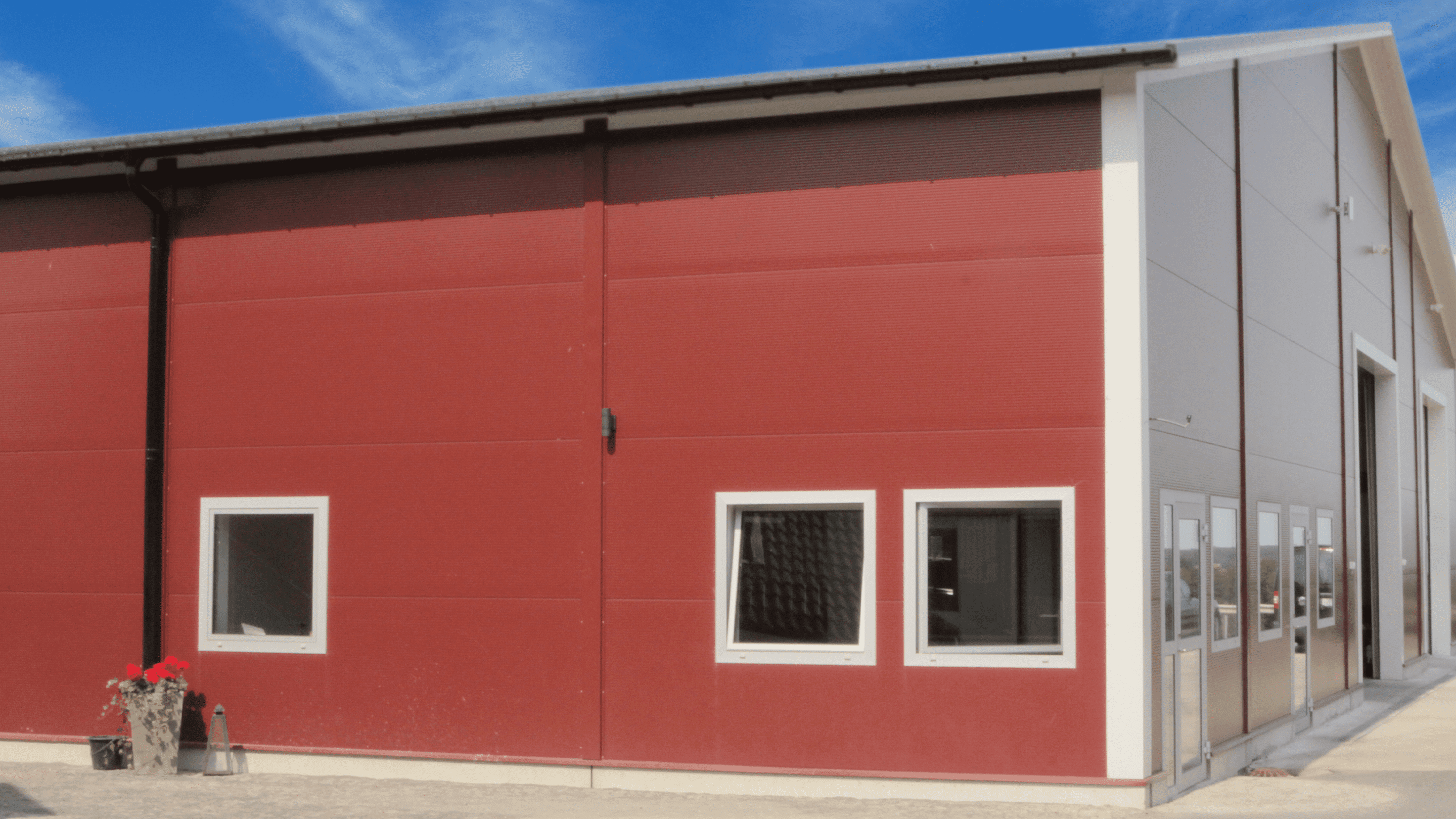 Väggar och tak består av sandwich. Hallen har även två stycken av Lindabs eldrivna taksjutportar. Grunden besår av Finjas plintgrund.
