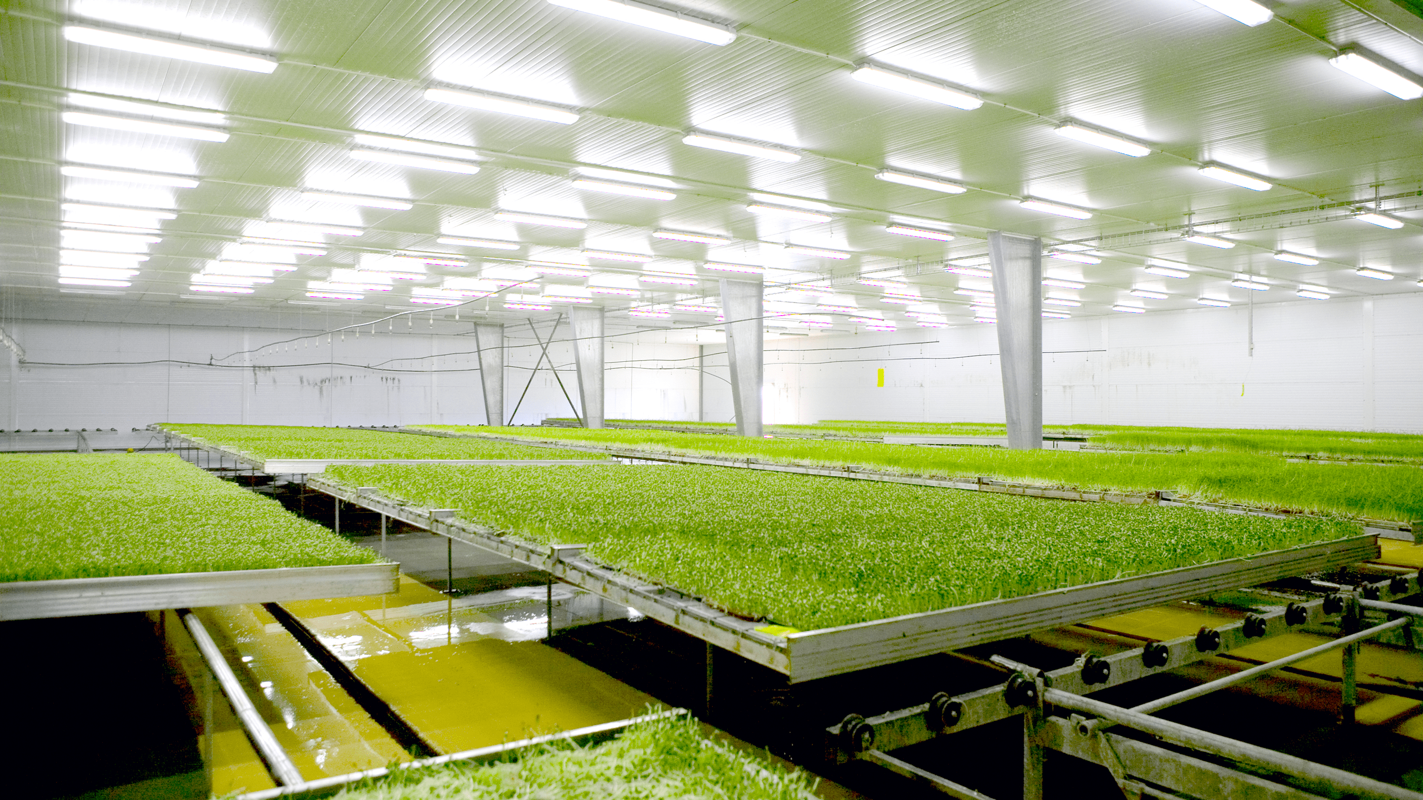 Den nya 3 000 m2 stora odlingshallens hjärta är utan tvekan odlingsrummet som upptar två tredjedelar av ytan. Under groningsfasen dimbevattnas odlingsbrickorna och när brickorna därefter flyttats ut på belysningsborden så sker bevattning varje timme dygnet runt. ”Det innebär stora mängder vatten och en mycket hög fuktighet i lokalerna”, förklarar Jan-Eric Andersson, Nyttogrönt.