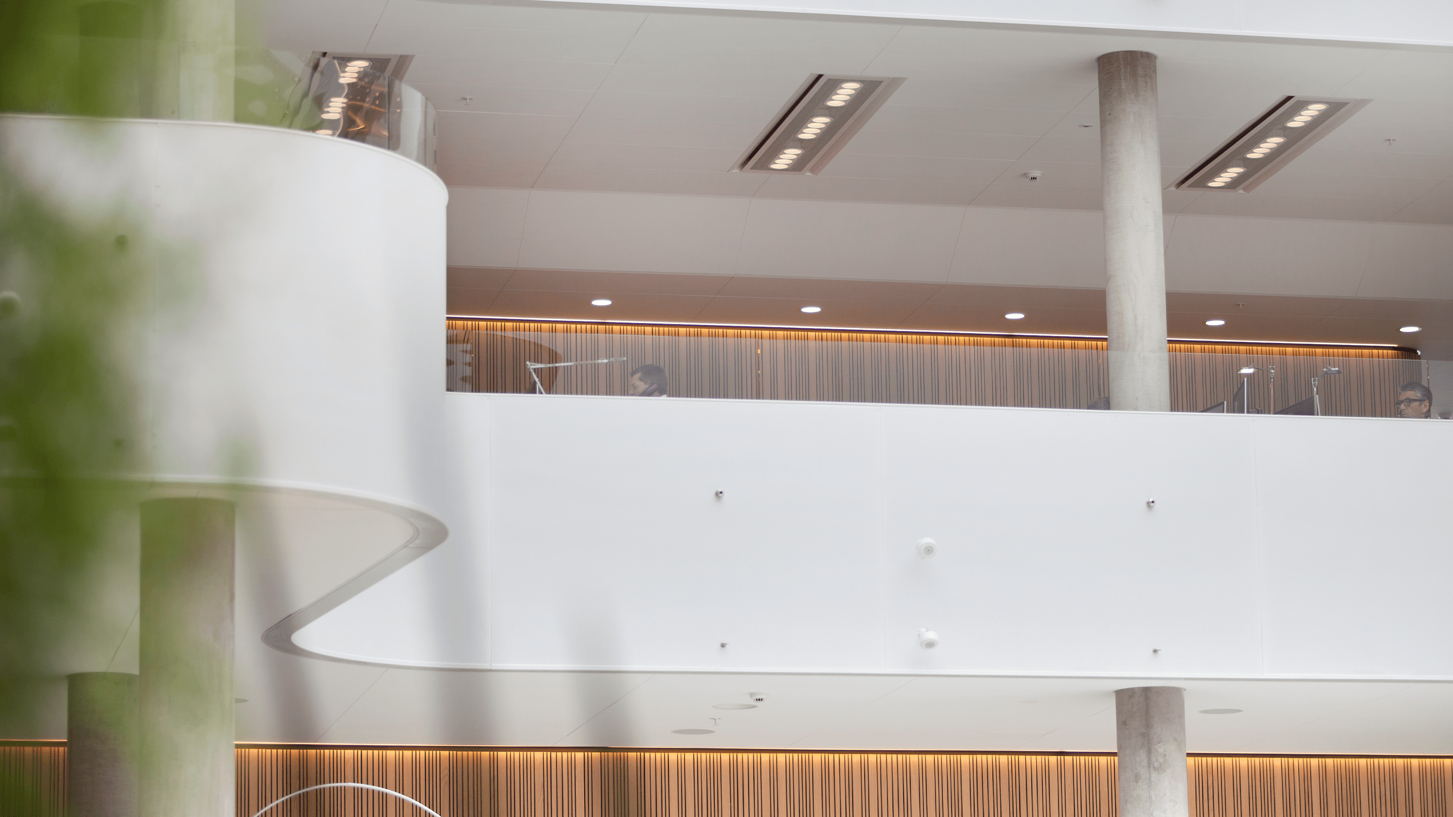 När man närmar sig huvudkontorets 16 000 m2 stora byggnad, slås man av de mjuka, rena linjer som PLH Arkitekter formgivit och ritat för DSV. När du kliver in i byggnaden möts du av det vackra ljuset från det väldiga glastaket. Härifrån syns också många av de Premumkylbafflar som Lindab levererat och som försetts med specialdesignade LED-armaturer, också de med ett mjukt, rundat formspråk