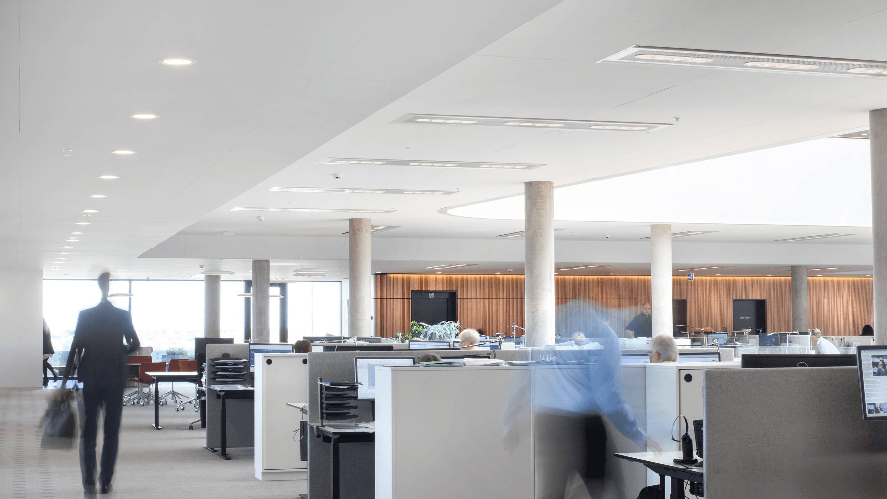 DSV är en global leverantör av transport- och logistiktjänster med ca 22 000 anställda och egna kontor i över 75 länder. Till koncernens huvudkontor i Hedehusene, strax utanför Köpenhamn, har Lindab levererat en komplett inneklimat- och ventilationslösning. Ett av de föreskrivna kraven var kylbafflar med inbyggd LED-belysning.