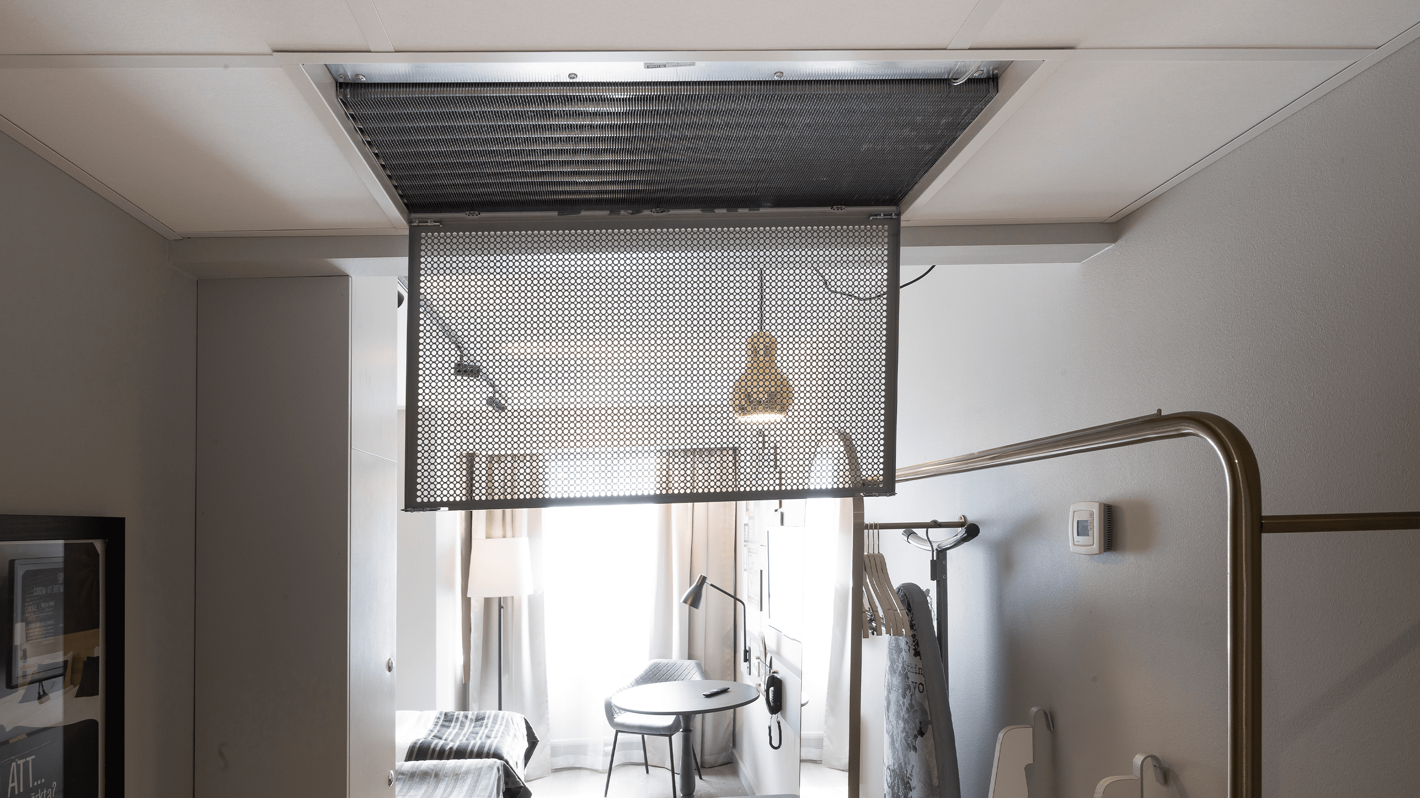 Munio är väl anpassat till det typiska takmontaget i ett hotellrums halldel. Lösningen har även anpassats för hotellets takmått och gör integrationen diskret i de 130 ombyggda rummen. För att rengöra kylbaffeln behöver man bara öppna gallerlåset. På så sätt är hela baffeln tillgänglig för snabb och enkel rengöring.