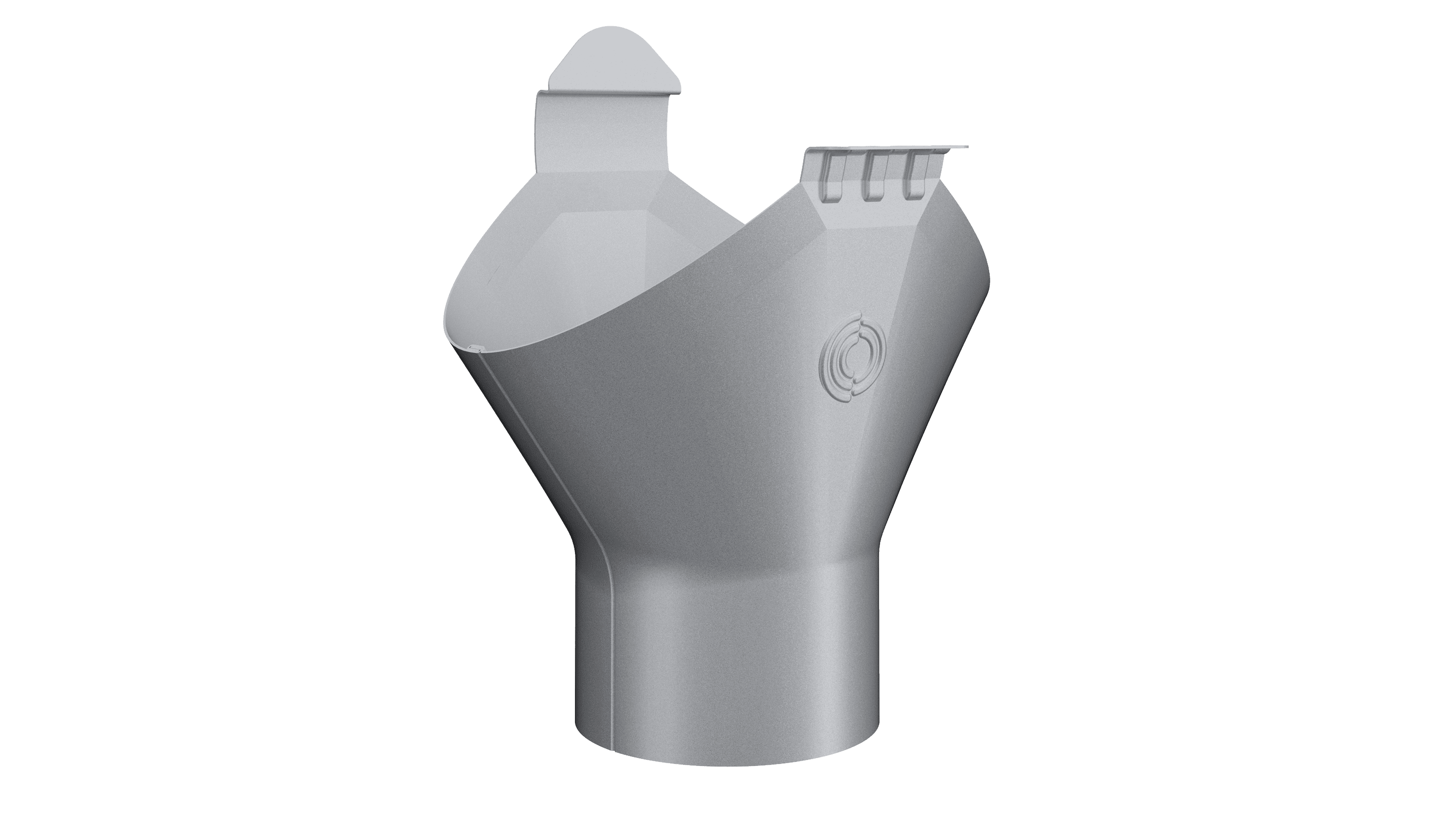 Omvikningskupa för montage mellan takränna och böj eller stuprör. Kupan klickas enkelt fast i rännan och det behövs inte några infästningar för att hålla den på plats. Nedre delen av kupan som ansluts mot böj eller stuprör har perfekt passform, och inte heller här behövs infästningar. Denna produkt är tillverkad av färgbelagd galvaniserat stål i 0,6 mm tjocklek.