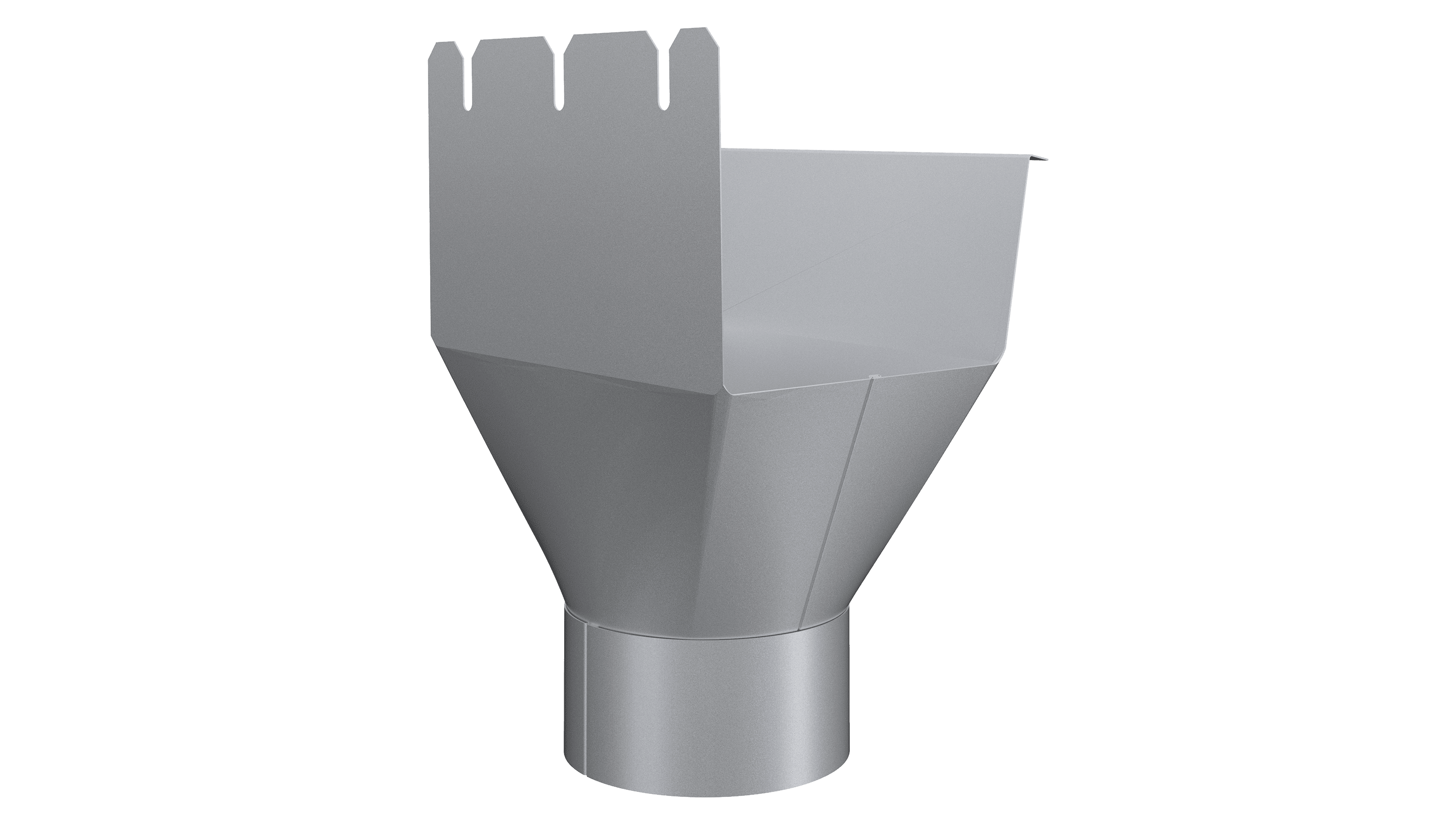 Rektangulär omvikningskupa för montage mellan rektangulär ränna och runt stuprör.