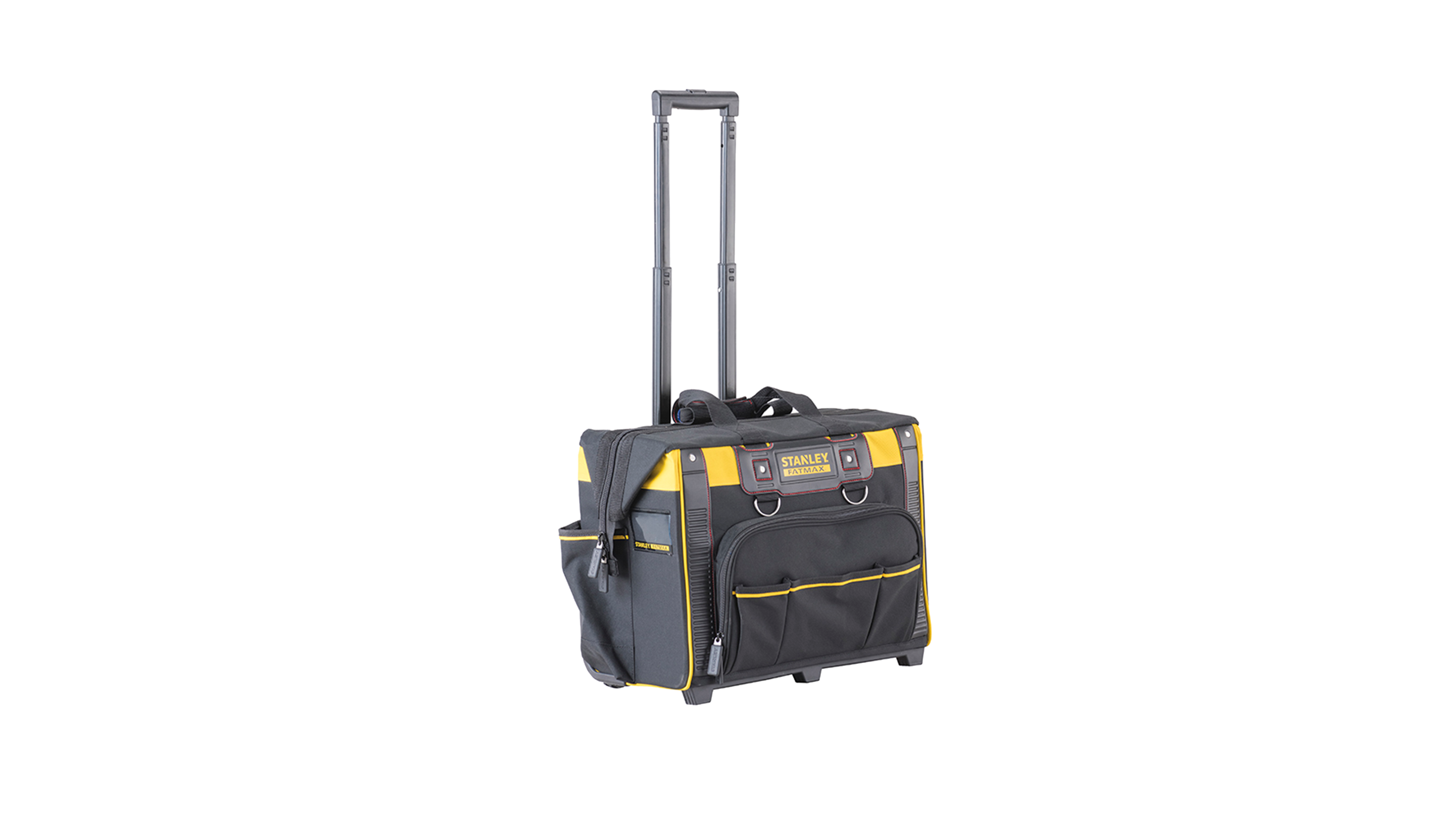 Stanley FatMax® verktygsväska FMST1-80148 har kullagrade kraftiga gummihjul och teleskophandtag för snabb och smidig transport utan ansträngning och tunga lyft. Tillverkad i stark och tålig rivsäker 600D tyg i ballistisk nylon med kraftig, formsprutad polypropylenram som gör väskan robust och tålig med snabb åtkomlighet tack vare en stor öppning och bra fack. Laptop väska kan sättas fast på handtaget (art.nr 3880149). Formgjutna fötter på undersidan som skyddar mot fukt och väta. Beslag i metall och förstärkt handtag och justerbar axelrem medföljer. Flera fickor och fack både in och utvändigt ger en bra överblick och ordning på verktygen. En framficka med dragkedja tillsammans med en stor öppen ficka på framsidan ger lätt åtkomlighet. Mindre fack på insidan för säker förvaring av smådelar eller personliga tillhörigheter. Tack vare dragkedjan kombineras fördelarna med väska och verktygslåda och ger ett effektivt väderskydd för dina el- och handverktyg. Mått: L: 58 cm B: 36 cm D: 41 cm