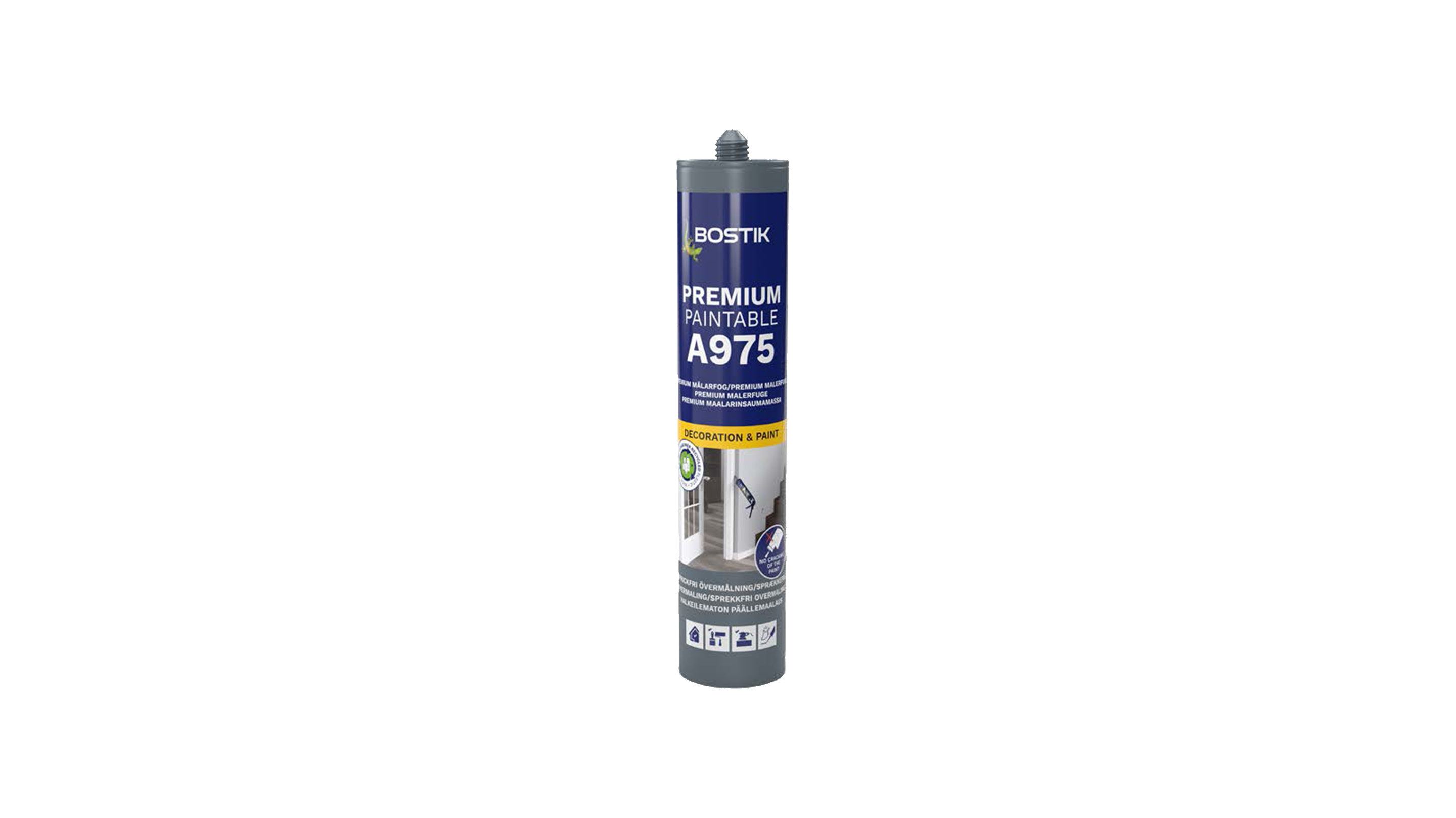 Bostik A975 Premium Paintable är en målningsbar akrylfogmassa av hög kvalitet, särskilt utvecklad för fogning runt trappor, väggar, tak, fönster och dörrar. Produkten ger en sprickfri finish och minimerar missfärgning vid övermålning med både vattenbaserade och syntetiska färger. Den fäster utmärkt på underlag som trä, gips, betong, tegel och metall, vilket gör den idealisk för både nyproduktion och renovering. Levereras i vit färg och är enkel att applicera med fogpistol.