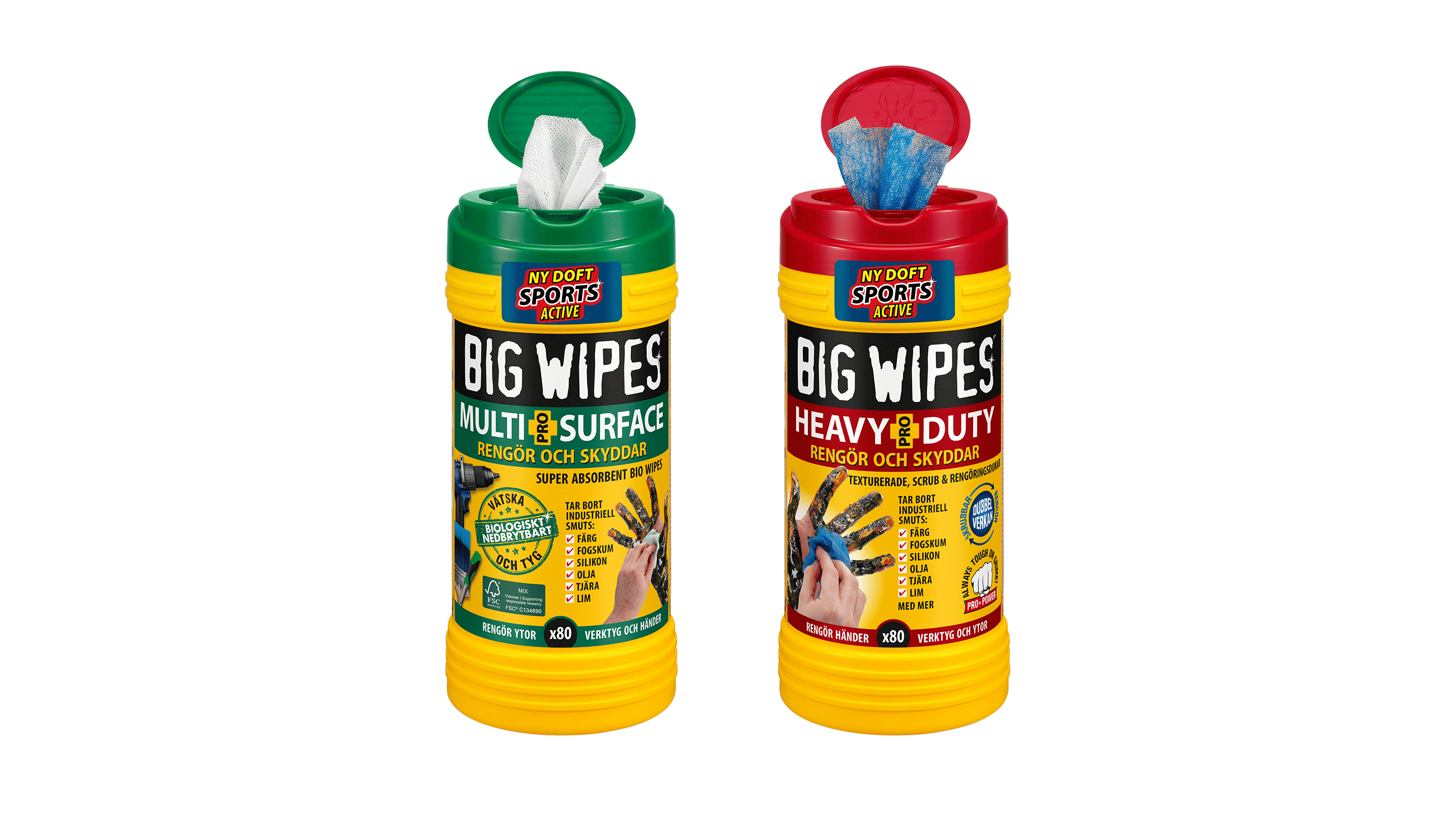 Heavy Duty‑varianten är anpassad för mer krävande situationer och klarar starkare föroreningar som epoxy, silikon, PUR‑lim och andra svårborttagna ämnen. Den luddfri grovduken ger ökad rivkraft utan att kompromissa med hudvänligheten, tack vare samma återfuktande formula som i övriga Big Wipes‑produkter.