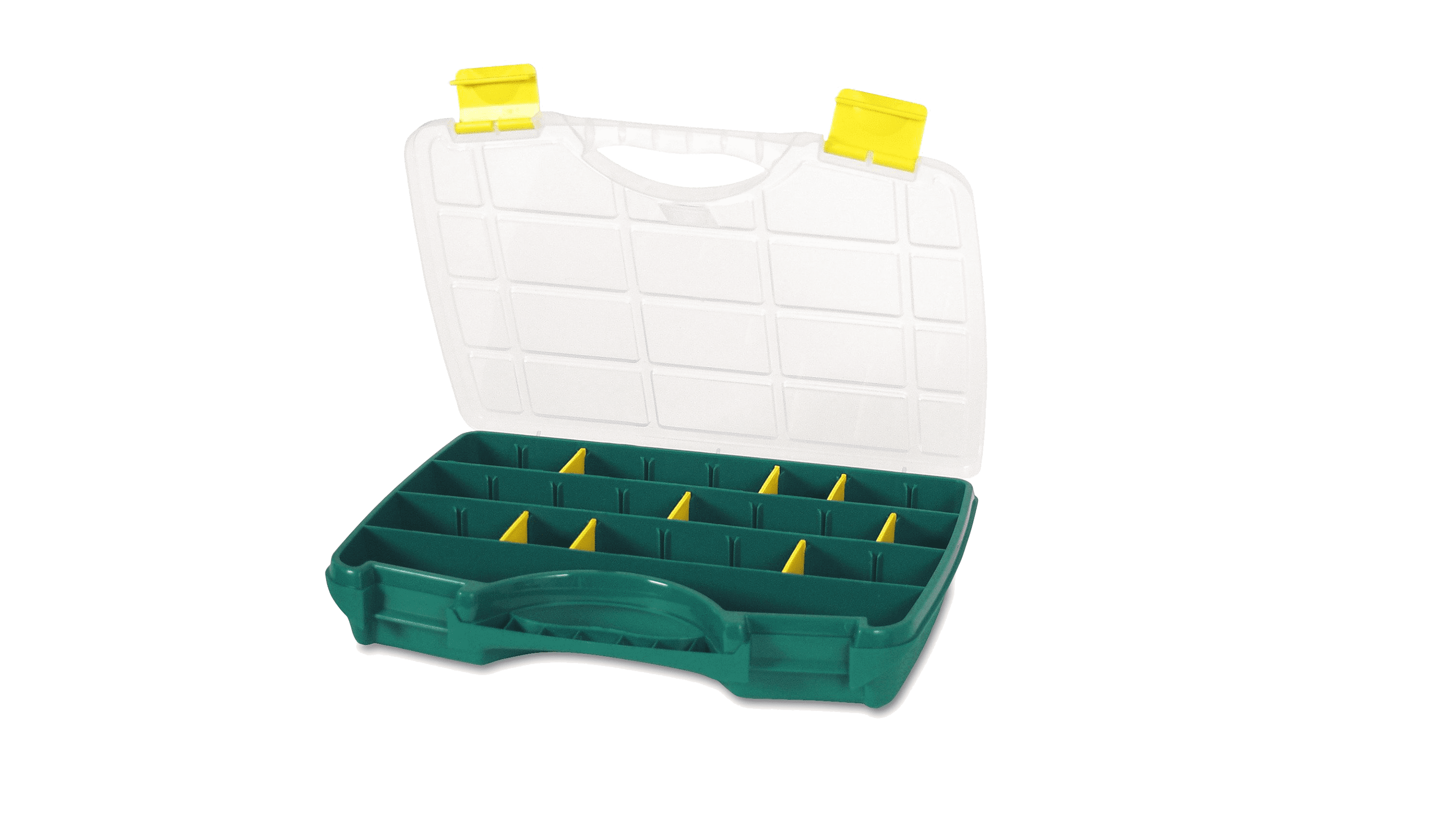 Tayg sortimentlådor med handtag är tillverkade i kraftig konstruktion med genomskinligt lock och dubbla snäpplås för bästa säkerhet av innehållet. Ingjutet bärhandtag och spår i locket för att förhindra rörelse av innehållet vid förflyttning. Lådan levereras med 21 st avdelara och kan delas in i 26 fack. Måttbenämning (mm): Längd / Bredd / Höjd: 312 / 238 / 51 mm.