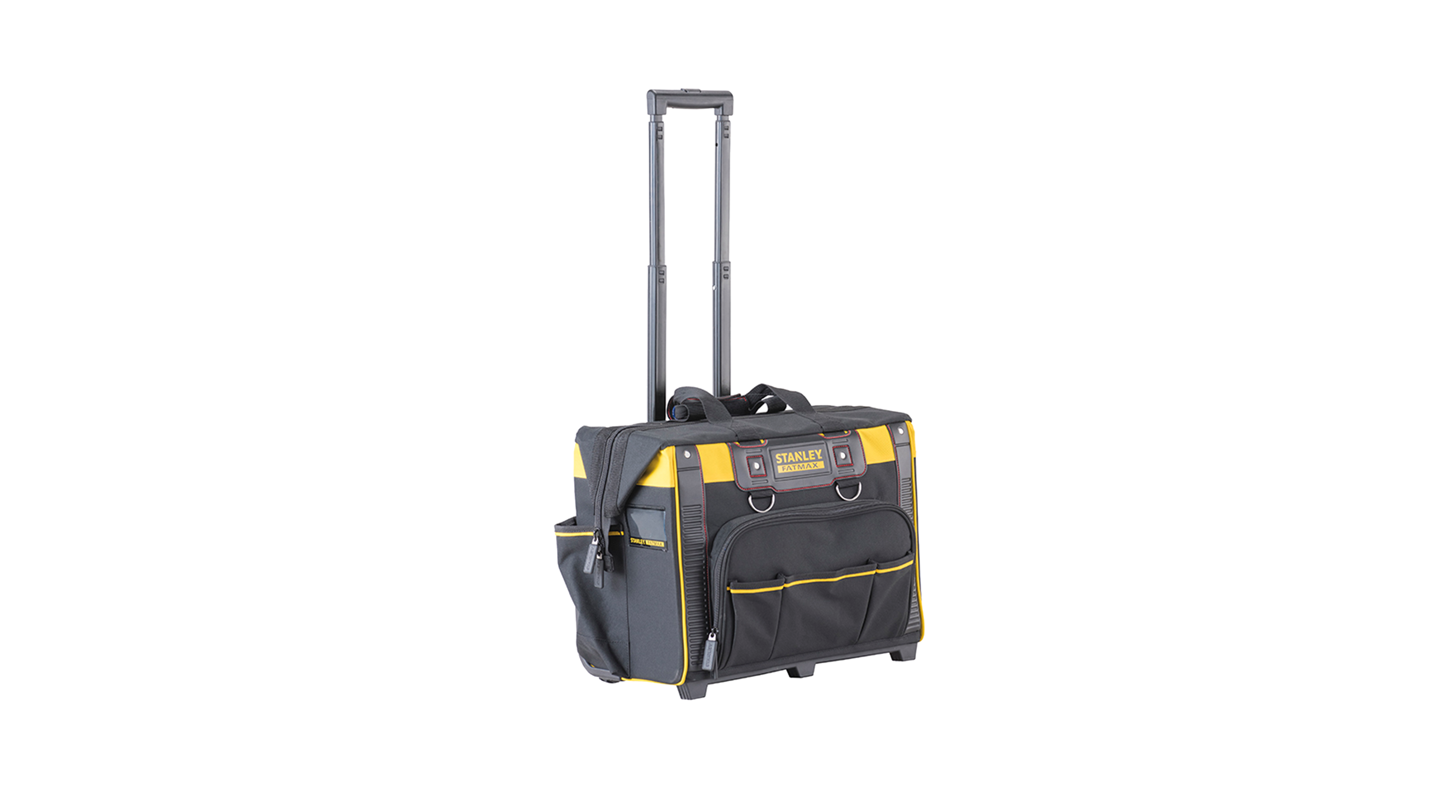 Stanley FatMax® verktygsväska FMST1-80148 har kullagrade kraftiga gummihjul och teleskophandtag för snabb och smidig transport utan ansträngning och tunga lyft. Tillverkad i stark och tålig rivsäker 600D tyg i ballistisk nylon med kraftig, formsprutad polypropylenram som gör väskan robust och tålig med snabb åtkomlighet tack vare en stor öppning och bra fack. Laptop väska kan sättas fast på handtaget (art.nr 3880149). Formgjutna fötter på undersidan som skyddar mot fukt och väta. Beslag i metall och förstärkt handtag och justerbar axelrem medföljer. Flera fickor och fack både in och utvändigt ger en bra överblick och ordning på verktygen. En framficka med dragkedja tillsammans med en stor öppen ficka på framsidan ger lätt åtkomlighet. Mindre fack på insidan för säker förvaring av smådelar eller personliga tillhörigheter. Tack vare dragkedjan kombineras fördelarna med väska och verktygslåda och ger ett effektivt väderskydd för dina el- och handverktyg. Mått: L: 58 cm B: 36 cm D: 41 cm
