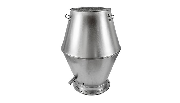 Huven tillverkas i galvaniserad stålplåt och kan mot beställning också erhållas i andra material såsom rostfri plåt 1.4301, rostfri syrafast plåt 1.4404, Zink Magnesium 310 och lackerad i olika färger. Den är försedd med nät för öppningen och invändig kägla för uppsamling av snö och regnvatten, som genom en slang leds ut från huven.